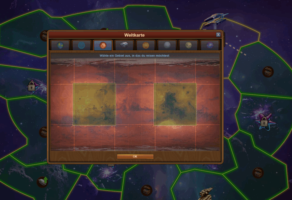 Auf dem Mars beginnt die Kolonie. Es ist entscheidend, die beiden Kontinentkarten 🌍 durchzukämpfen, um an die Ressource Mars-Erz ⛏️ zu gelangen.